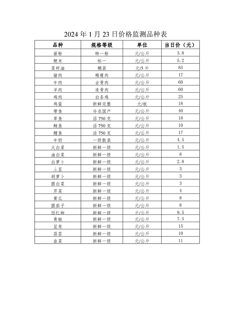 2024年1月23日价格监测品种表