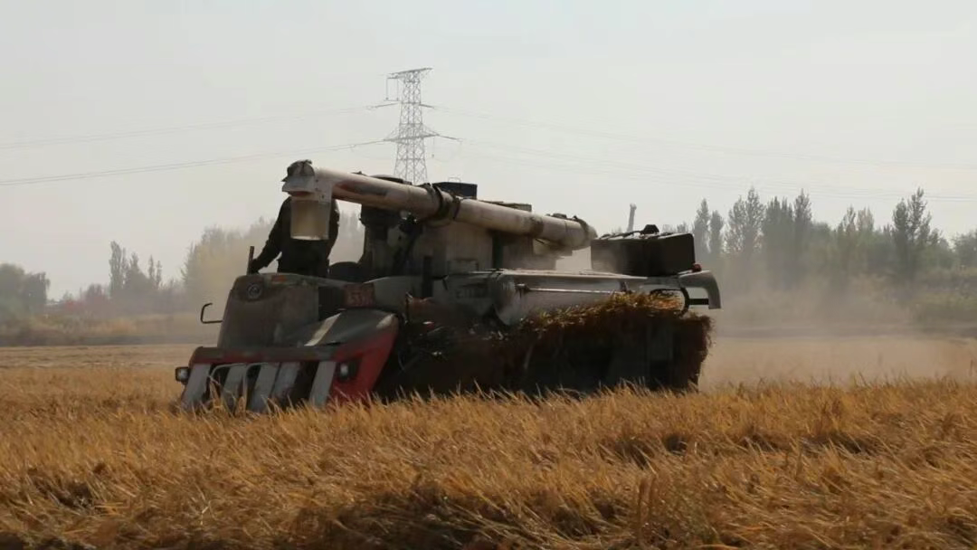 10月10日,在察布查尔县水稻示范田实收测产现场,专家组正在指导水稻收割机有序收割,并仔细测量水稻的水分、杂质及产量。