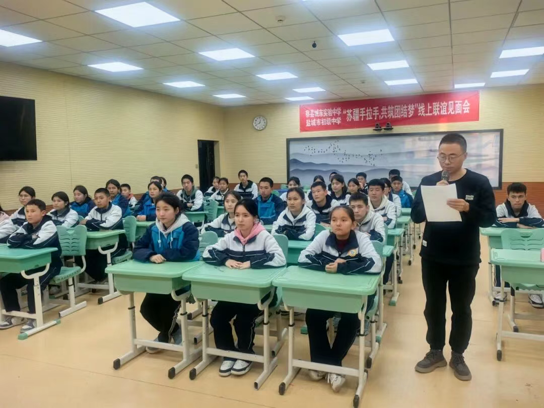 活动在盐城市初级中学学生与察布查尔县城东实验中学学生的共同朗诵中拉开序幕。“盐城察县千里遥,云端相聚情意绕”“天山黄海一线牵,青春同心筑梦桥”的表达,拉近了两地师生的心理距离。
