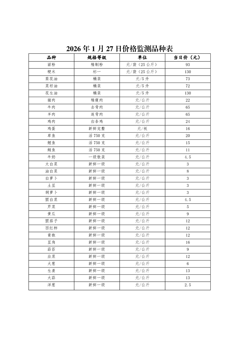 2026年1月27日价格监测品种表
