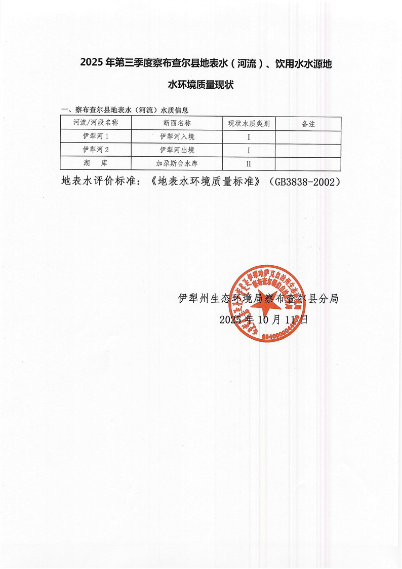 2025年第三季度察布查尔县地表水(河流)、饮用水水源地水环境质量现状