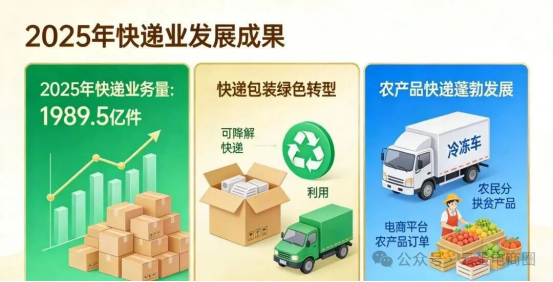 2025年快递业务量完成1989.5亿件,连续12年世界第一,同比增长13.6%,快递营业收入达到14939.3亿元,同比增长6.5%。月均超160亿件,单日最高7.77亿件,每秒超6200件……,我国快递包装绿色转型加快,年回收复用纸箱超8亿个。近年来,我国电子运单、循环中转袋基本实现全覆盖,包装箱层数和包装袋厚度减量超半,胶带宽度减量25%,智能装箱算法减少耗材近20%,同城快递循环包装比例达10%。在包装回收利用方面,年回收复用纸箱超8亿个。邮政等4家企业还在20余个城市生鲜冷链、政务文件等场景试点应用循环包装,推动资源循环利用。农产品快递十分活跃并发挥了重要作用。