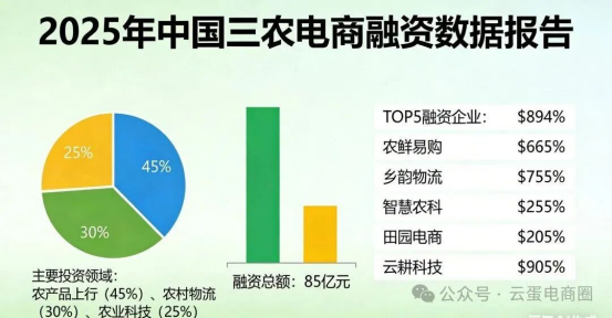 据“电数宝”电商大数据库(DATA.100EC.CN)显示,2025年,国内三农电商领域共发生了2起投融资事件,涉及的公司包括:麦麦科技、抢农资网,融资总金额为1亿元。麦麦科技集团完成Pre-A轮融资,募资金额超过1亿元,估值规模超过11亿元,成为近期智慧农业领域最大规模的早期融资。本轮投资由启鸿育远、星连资本、春光里、鸿链启元等机构联合领投,部分老股东跟投。抢农资网母公司河南农要电子商务有限公司,完成2000万B轮融资,投资方为河南省产业集聚区发展投资有限责任公司。此次河南省产业集聚区发展投资有限责任公司的投资有助于扩大就业,支持农资电商行业发展,解决企业“融资难,融资贵”问题。本轮投资,将加速抢农资网发展,帮助企业提升客户体验和市场占有率。
