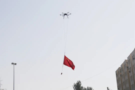 致辞结束后,精彩的无人机展演环节拉开帷幕。山西云涂航校教员按下启动键,一架多旋翼无人机悬挂着鲜艳的五星红旗腾空而起,在蓝天白云的映衬下迎风招展。在场师生自发起立,齐声唱响国歌,掌声与欢呼声响彻校园。