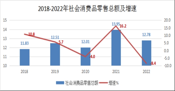 全年社会消费品零售总额12.78亿元,比上年下降8.4%。按经营地统计,城镇消费品零售额10.19亿元,比上年下降2.1%;乡村消费品零售额2.59亿元,比上年下降26.7%。按规模统计,限额以上单位消费品零售额3.54亿元,增长41.9%。
