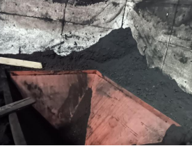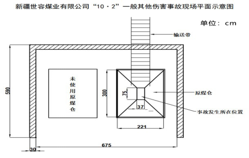 经勘察,事故现场煤炭烘干系统原煤仓及原煤仓挡墙(混凝土现浇挡墙,厚度约为30cm)存在煤炭堆积痕迹,原煤仓下料斗底部出料口设输送带。原煤仓下料斗上端与地面平齐,下料斗长约300cm,宽约221cm;原煤仓下料斗底部出料口长约75cm,宽约37cm;原煤仓下料斗深约130cm;原煤仓为金属铁质焊接成型,原煤仓下料斗4面侧壁光滑,侧壁坡面与水平面约呈63°(事故发生区域:原煤仓现场平面示意图见下图)。现场见该生产线设计及安装基础为双线,目前仅单线安装运行。事故现场因事故救援造成一定程度破坏,未能保持事故发生当时现状。