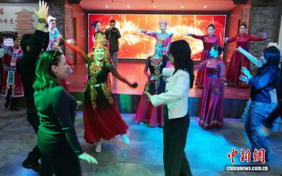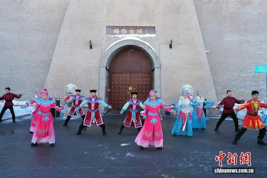 1月10日,游客在锡伯古城与当地专业舞者一起舞蹈。锡伯古城位于新疆伊犁察布查尔县境内孙扎齐牛录镇,是面向全国及中亚打造的集特色城镇化基地、传统历史文化名胜浏览、主题游乐、休闲度假功能于一体的综合性旅游目的地。古城总体布局坚持文化铸魂、城建塑形、旅游扬名,体现多元一体理念,是各民族休戚与共、团结发展的历史见证。锡伯古城的建成,为人们更深入了解锡伯族、了解察布查尔打开了一扇门。游客可以在古镇全方位了解锡伯族的历史文化、西迁壮举、民俗风情等,可以体验锡伯族传统的饮食、服饰、刺绣、弓箭、舞蹈等多元民族习俗。 锡伯族作为古代鲜卑族的后裔,历史悠久,至今保存着很多珍贵的文化遗产,在长期的新疆屯垦戍边中形成了其独特的文化,在保留原有锡伯族语言文字的基础上积极融合其他民族先进的文化,同时保留了许多民间故事、历史文物古迹,不同程度的反映了锡伯族在不同时期的社会生活风貌,有着深刻文化内涵。