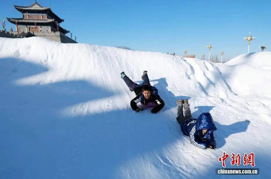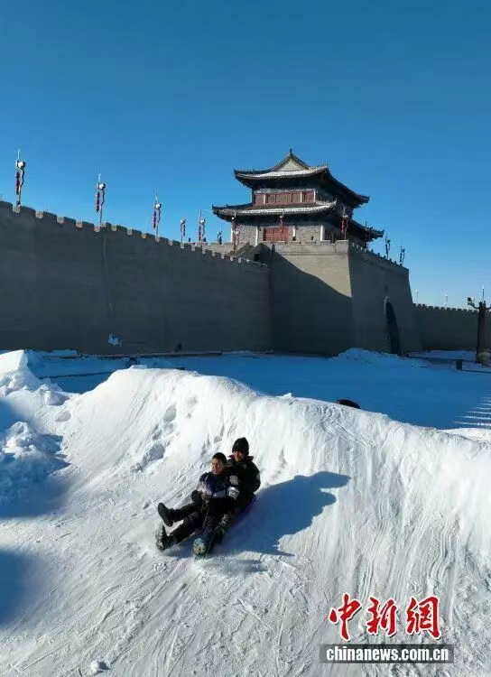 1月10日,儿童在锡伯古城外滑雪。锡伯古城位于新疆伊犁察布查尔县境内孙扎齐牛录镇,是面向全国及中亚打造的集特色城镇化基地、传统历史文化名胜浏览、主题游乐、休闲度假功能于一体的综合性旅游目的地。古城总体布局坚持文化铸魂、城建塑形、旅游扬名,体现多元一体理念,是各民族休戚与共、团结发展的历史见证。锡伯古城的建成,为人们更深入了解锡伯族、了解察布查尔打开了一扇门。游客可以在古镇全方位了解锡伯族的历史文化、西迁壮举、民俗风情等,可以体验锡伯族传统的饮食、服饰、刺绣、弓箭、舞蹈等多元民族习俗。 锡伯族作为古代鲜卑族的后裔,历史悠久,至今保存着很多珍贵的文化遗产,在长期的新疆屯垦戍边中形成了其独特的文化,在保留原有锡伯族语言文字的基础上积极融合其他民族先进的文化,同时保留了许多民间故事、历史文物古迹,不同程度的反映了锡伯族在不同时期的社会生活风貌,有着深刻文化内涵。