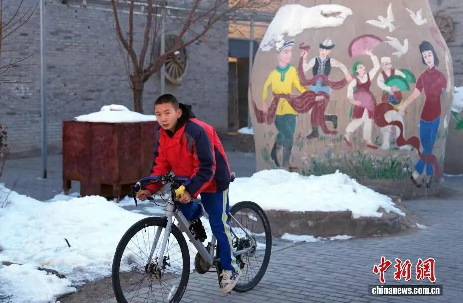 1月10日,少年在锡伯古城内骑行。锡伯古城位于新疆伊犁察布查尔县境内孙扎齐牛录镇,是面向全国及中亚打造的综合性旅游目的地。锡伯族作为古代鲜卑族的后裔,历史悠久。锡伯族人至今相对完好地保存着锡伯族的语言文字、民间歌舞、饮食文化、服饰刺绣、体育娱乐等传统文化,其中有不少已被列入各级非物质文化遗产保护名录。